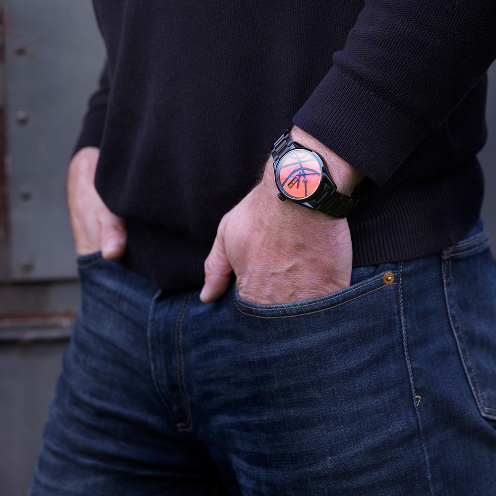 The dial displays a hand drawn basketball design by Jonas Wood which is the centrepiece of the watch, and a theme familiar to his practise. The watch is further complimented by a bespoke wooden presentation box in the style of a basketball court with a handwritten print of ‘Bamford Watch Department’ drawn by Jonas. Each timepiece in this limited edition set is engraved with the artist’s signature on the case back.