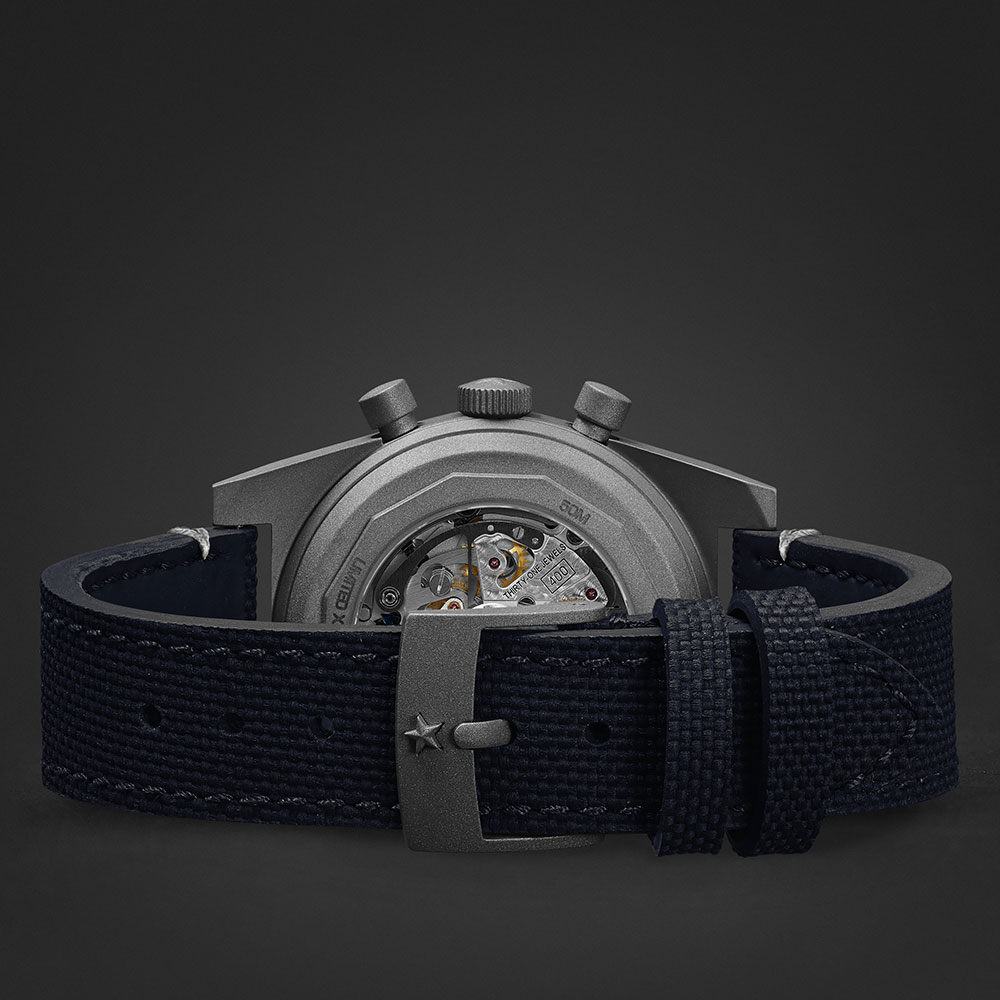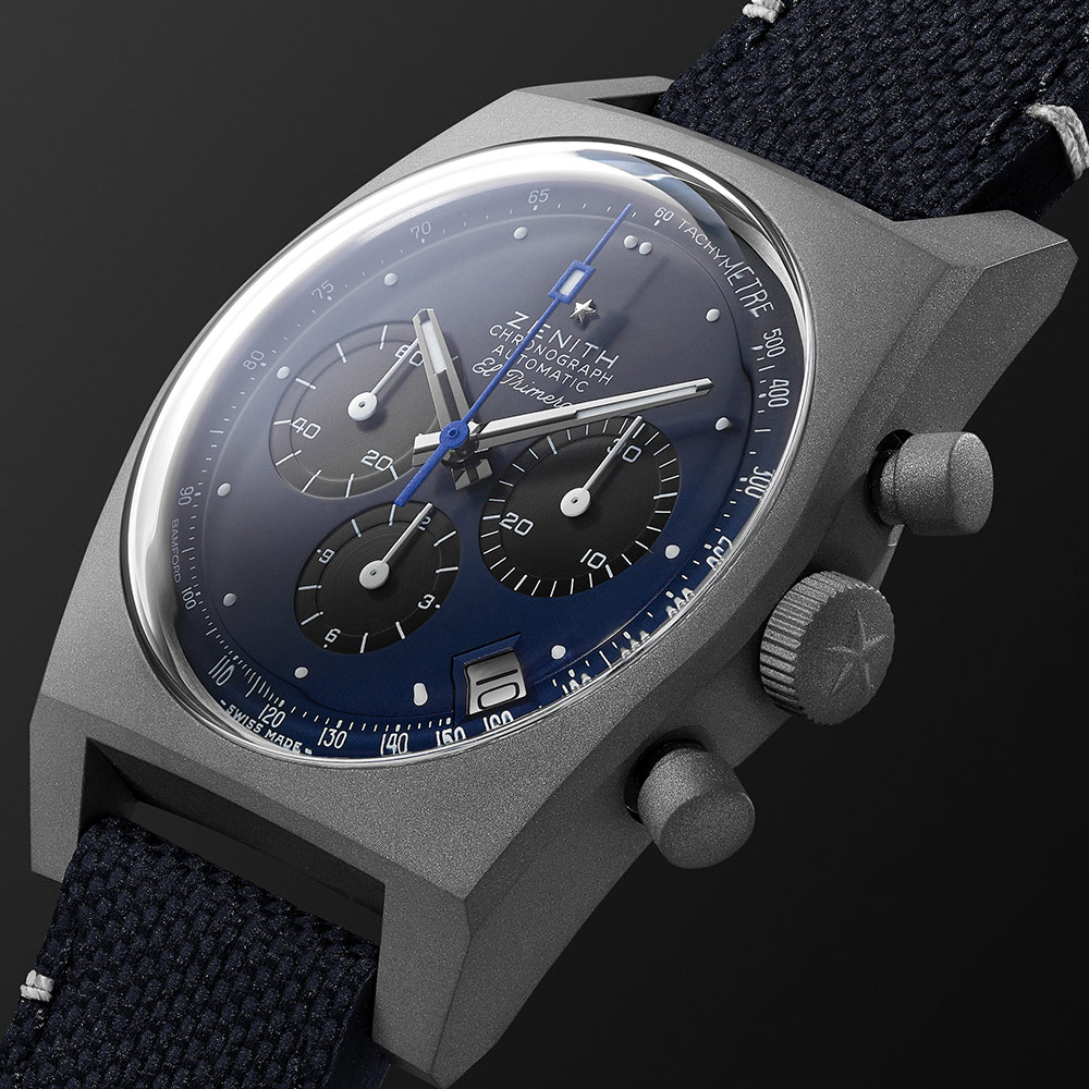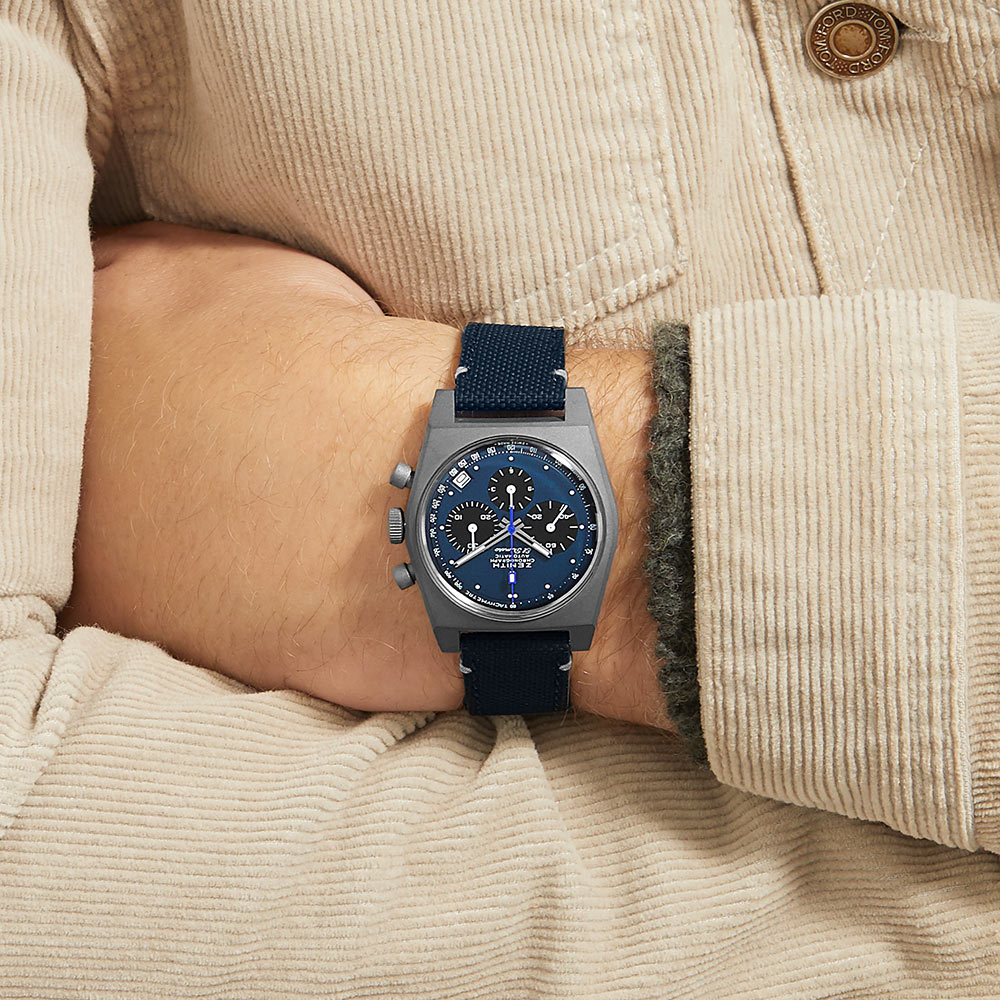 Inspired by the Zenith El Primero Revival A384 model, the watch picks up several of the brand’s historical design elements. These subtle touches include the tachymeter, which references back to a 1984/86 El Primero, subdials evoking the calibre 146-HP from 1970, aesthetic reminders of a vintage chronograph case alongside vintage dial text font restored from the original A384. Its unique “Edge of Space” blue dial is framed by a 37mm titanium micro blasted case, fitted with a navy blue Cordura-effect rubber strap featuring minimal white stitching designed to complement the white dial markings.